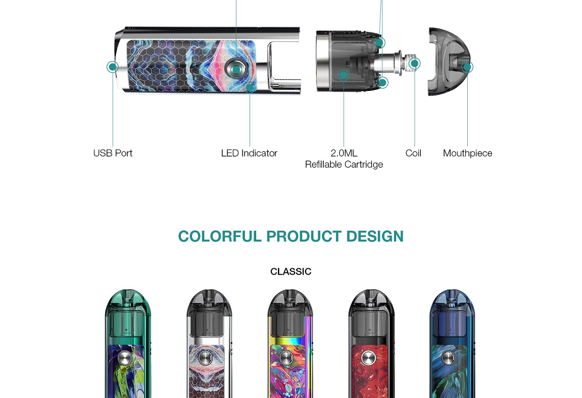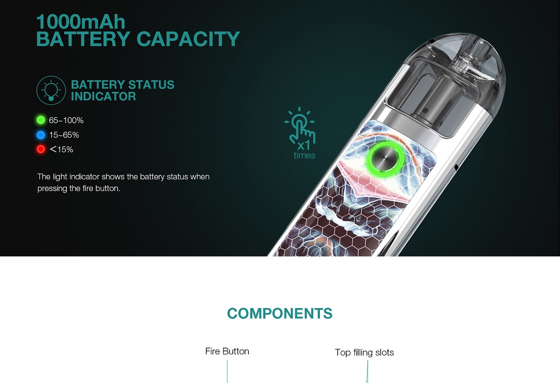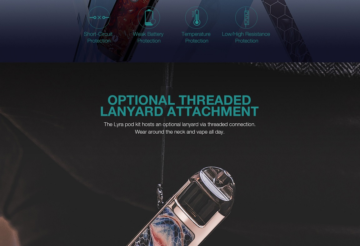 Lost Vape Lyra Kit is a new pod system device with multiple protections and supports USB charging. Powered by a built-in 1000mAh battery with 2ml replacement pod cartridge, utilized smart improvement for installing or taking off the pods, it's easy to fill. With two kinds of Lyra mesh coils, it is suitable for regular e-juice. And the battery indicator will inform you at low voltage, this is an advanced device! With the single firing button, it brings a simple vaping experience.
