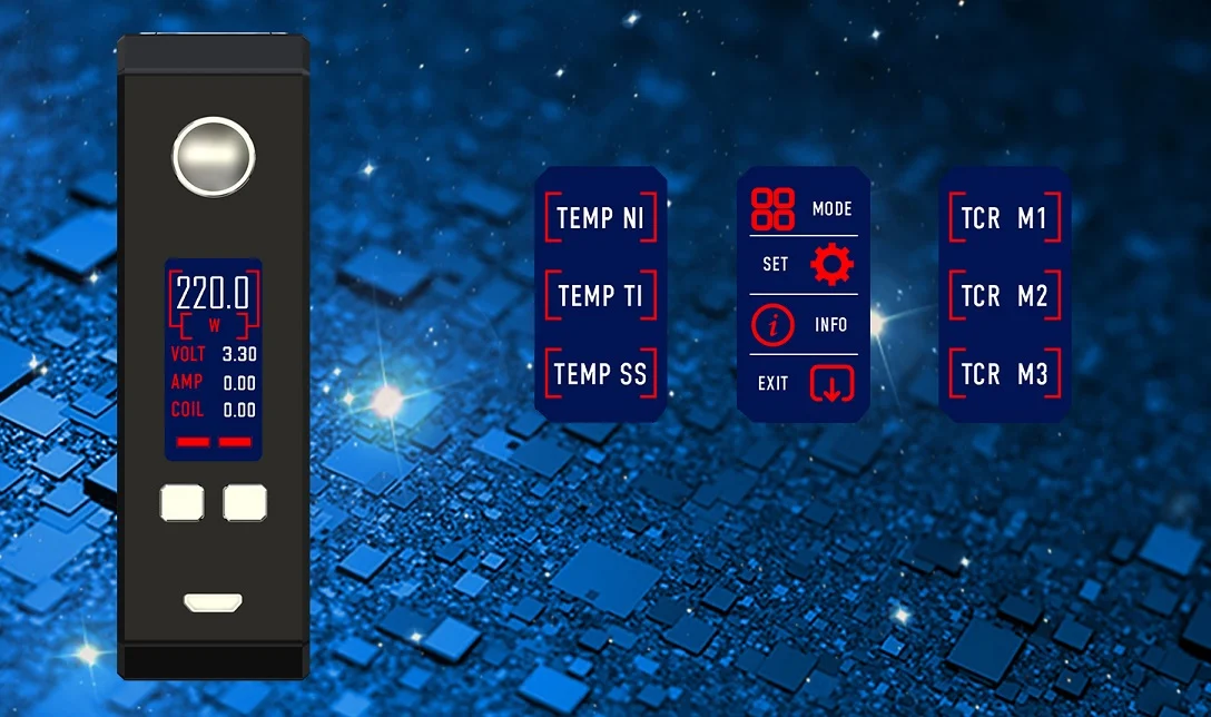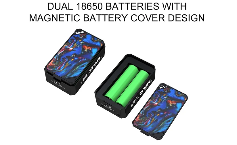 MyVapors Myuz SS5 Kit features colorful double-sided resin panels which performance like gas planet-Jupiter. Powered by dual 18650 batteries, the output can reach up to 220W. Comes with large HD color screen that displays specific data. The Magnetic Battery Door provides a brilliant and great visual effect, it also makes battery replacement easier. As for the Myuz SS5 tank, it comes with a large capacity of 6.5ml and a super convenient top filling design. Plus the revolutionary SS5-N Coil and SS5-M Coil, the Myuz SS5 will bring you an unexpected experience.