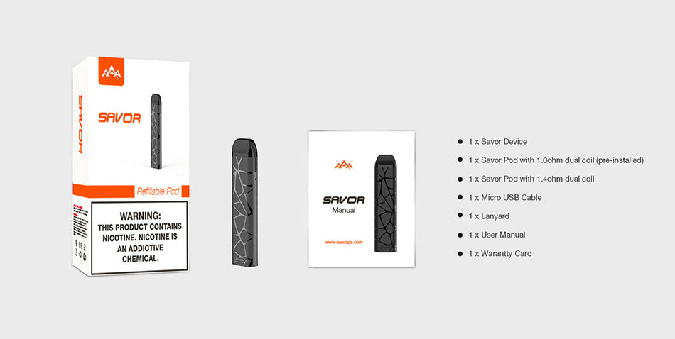 1 x Savor Pod with 1.4ohm dual coilv 1 x Micro USB Cable