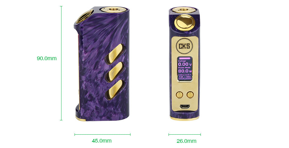 CKS X Asmodus Stride VR-80 80W TC Box Mod features a unique shape to suit the contour of the hand with added finger grips for further comfort. Users will be attracted initially to its colorful hybrid stone design and gold-plated finish. It's a single 18650 box mod with max 80W output power. The VR80 can work with Ni200, Ti and Stainless steel 316 wires under temperature control modes. You can also customize the font and background color of the big screen. You can carry and hold the Stride with a comfortable hand feel thanks to the design.