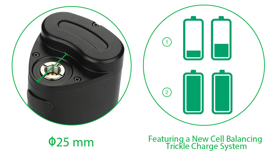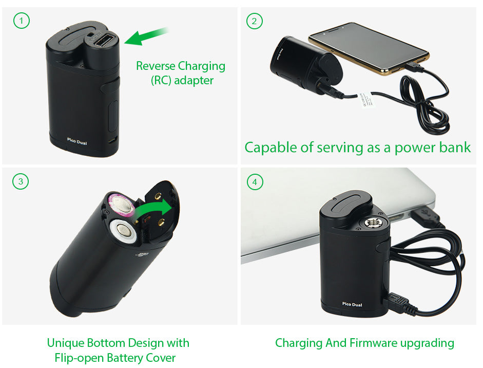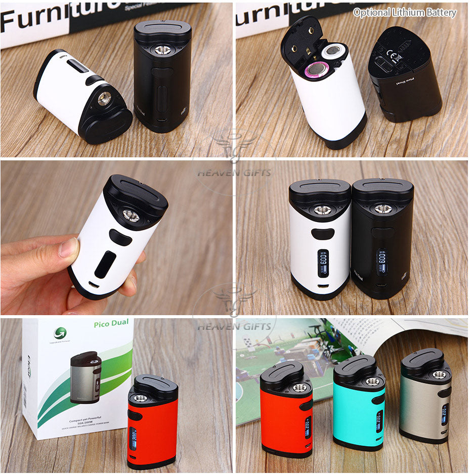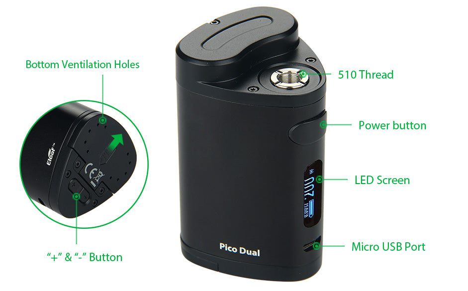Eleaf iStick Pico Dual 200W TC Vape Box Mod measures 46mm x 44mm x 75mm, designed in a small compact size and powerful output. Powered by two high-drain 18650 batteries, the Pico Dual provides the vaper with double the battery life and 200 watts of sheer power. This compact vape box MOD takes custom tailored ergonomics and a comfortable grip for the smoothest vaping experience. The Eleaf Pico Dual offers the vaper unrivaled Wattage mode with a precision temperature control mode that will fire your Nickel, Stainless Steel and titanium coils to perfection. Charge your electronic devices using your MOD with an RC adapter that mounts directly to your 510 connection providing 1.5 amps of quick charging power.