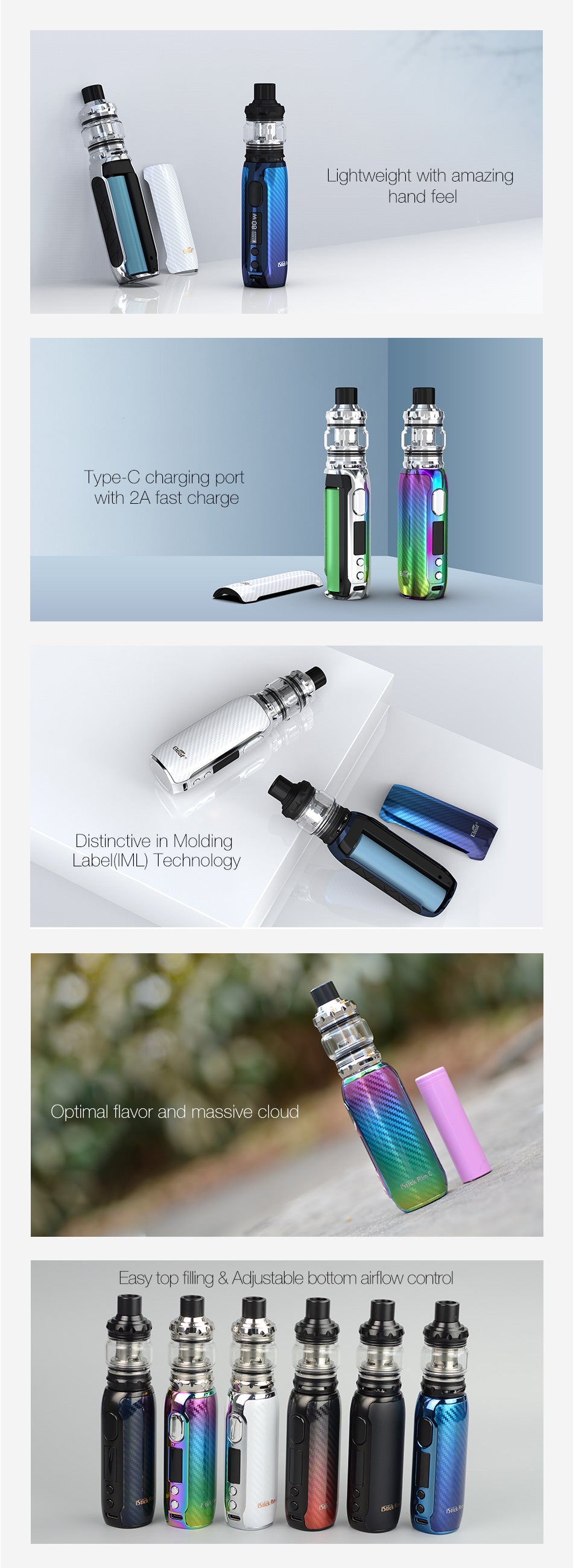 The Eleaf iStick Rim C Kit has an elegant appearance, and rounded body design makes it comfortable to hold in hand. Powered by single 18650 battery, with fast Type-C charging, the Eleaf iStick Rim C can achieve a wattage range from 1W to 80W. Moreover, you can choose different working modes like TC to serve your different taste demand. The anti-dry-burn mechanism of Eleaf iStick Rim C will ensure a safe vape too. Eleaf MELO 5 Atomizer can hold up to 4ml of e-juice(2ml for TPD version) whilst featuring an easy top fill structure and the adjustable bottom airflow system with childproof lock design. This tank is compatible with many coil heads of EC series, included in the package is a 0.15ohm EC-M rated between 30-75W and a 0.6ohm EC-S rated between 15-30W. Just get the Eleaf iStick Rim C Kit and enjoy it!