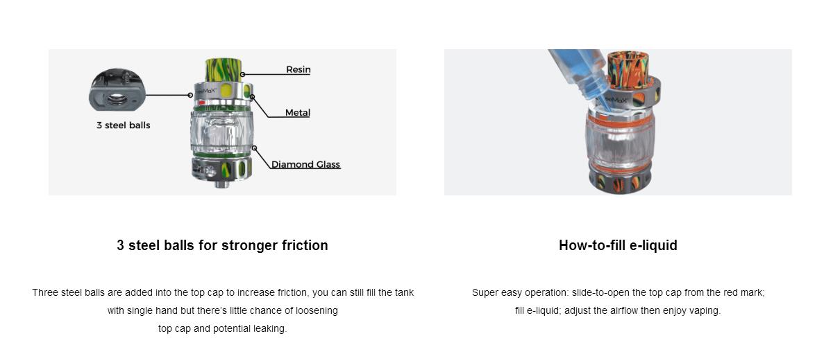 M Pro 2 is an updated successor of the reputable M Pro tank. With upgraded Top-Fill Mechanism and the latest generation of FM COILTECH 4.0 mesh coil technology, the diameter of M Pro 2 Tank is still 25mm, and the tank capacity can fill up to 5ml of your favorite electronic juice. M Pro 2 Tank is still slide-to-open top-fill design but is added with 3 steel balls to increase the friction when slide to open the top cap. It is made of resin and stainless steel structure, which is both beautiful and durable. A new series coils comes with the tank - 904L M1, M2, M3, and M4 mesh coils. The coil tech is also updated to FM COILTECH4.0 with military-grade SS904L mesh material and tea fiber cotton for more stable vaping experience and refreshflavors. What's more, the tank is newly designed with stunning diamond glass tube together with resin colors, integrated with beauty and durability.
