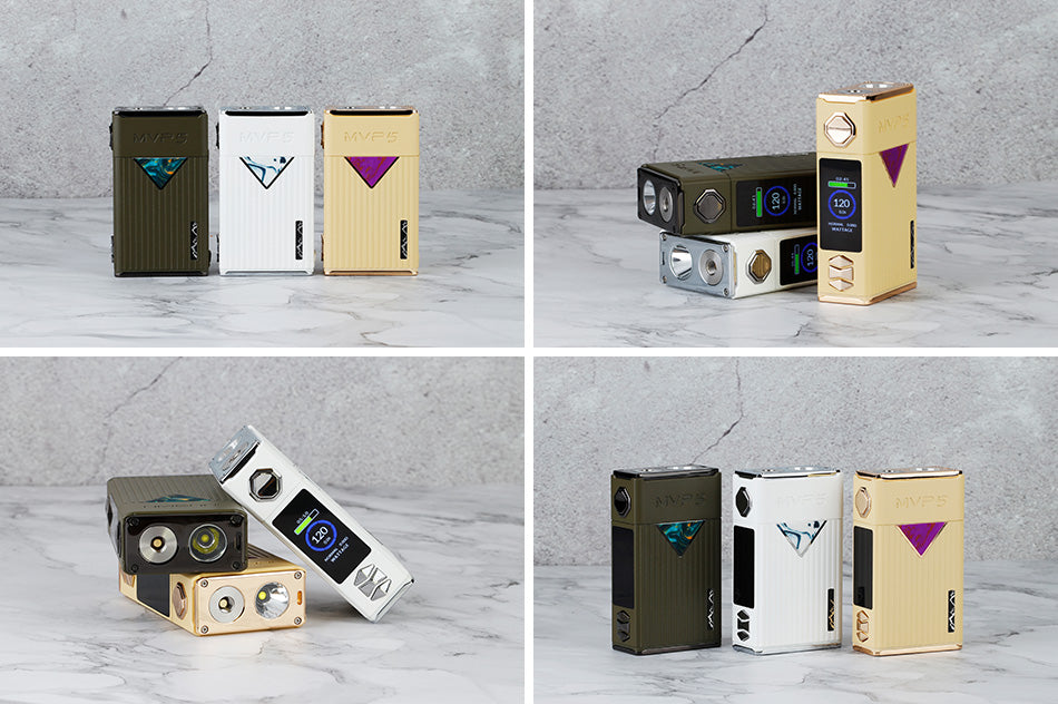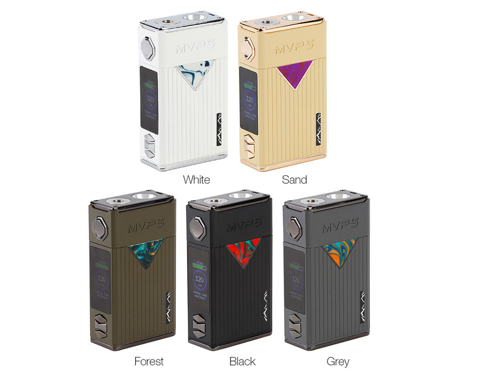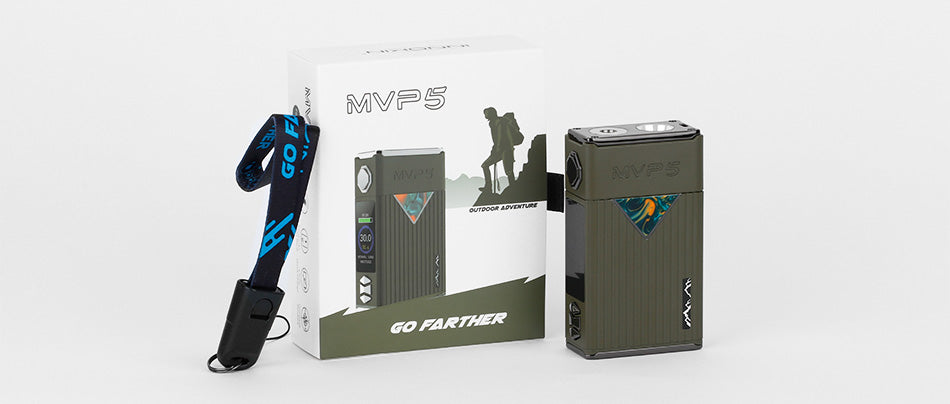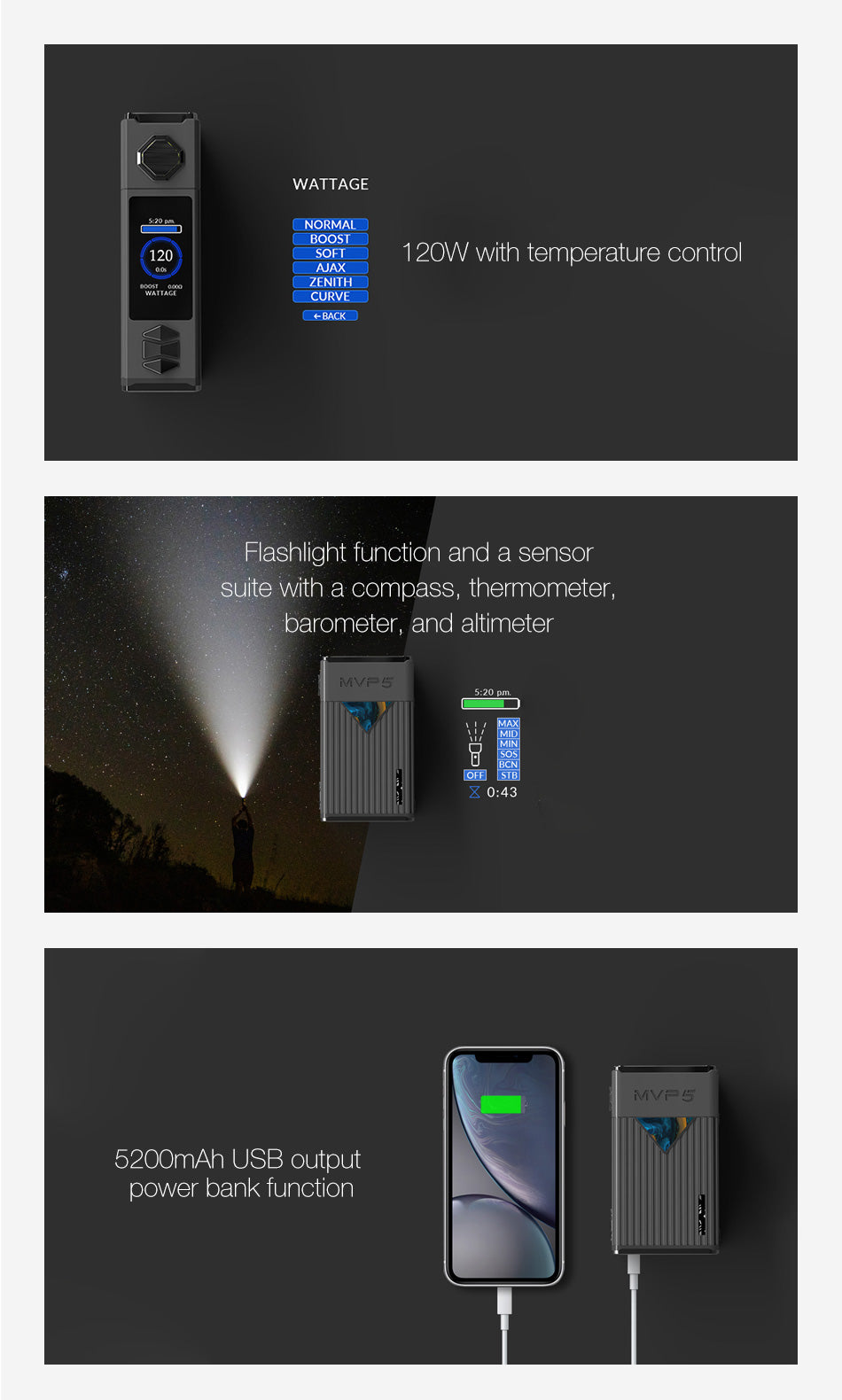 The Innokin MVP5 TC Box Mod is powerful and functional, and beautiful in appearance, also compatible with Ajax Tank. Powered by 5200mAh built-in battery with 120W max output, it is charged via Type-C micro USB. The Innokin MVP5 comes with 3 Wattage Modes (Normal, Boost and Soft), Temperature Control, TCR, 4 Memory Curve and optimized "Easy Select" wattage pre-sets for Ajax (DTL) and Z-Coils (Zenith/Zlide)(MTL). More than a Vaporizer, the MVP5 also acts as a survival tool, such as Flashlight, Power Bank, Sensor Tool (Compass, Thermometer, Barometer, and Altimeter), and other functions, for outdoor activities or emergencies. Constructed from durable zinc-alloy, the chassis of the Innokin MVP5 Box mod can withstand rugged usage and can easily deal with light to moderate falls or drops. In a word, the MVP5 has been redesigned and updated with an all-new rugged and sturdy look perfect for the outdoors.