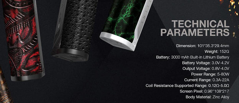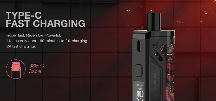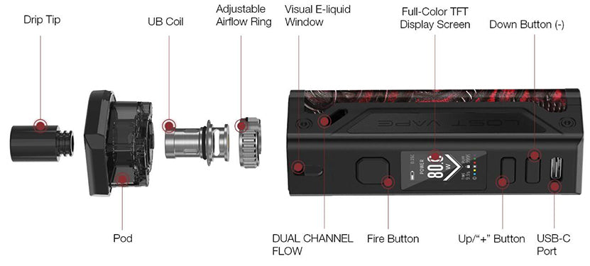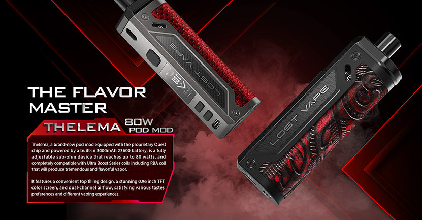 Lost Vape Thelema discards the traditional pod system design. It provides an excellent visual and tactile sense. The device shell is made of Zinc Alloy which is supplemented by leather design. It is powered by 3000mAh built-in battery with 80W max power, which will satisfy your all-day vape demand. Designed with type-c 2A charging port. the charging is proper fast, reversible and powerful. Thelema Kit also comes with a 4ml visual pod that is compatible with all Ultra Boost Series Coils, including RBA. The pod is built with top filling and plug-play coil replacing. Besides, it features dual-channel airflow and adjustable airflow. There are six theme colors for you, you can enjoy the colorful theme and see the crucial data with a 0.96 inch TFT color screen.