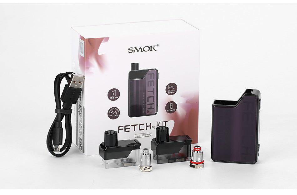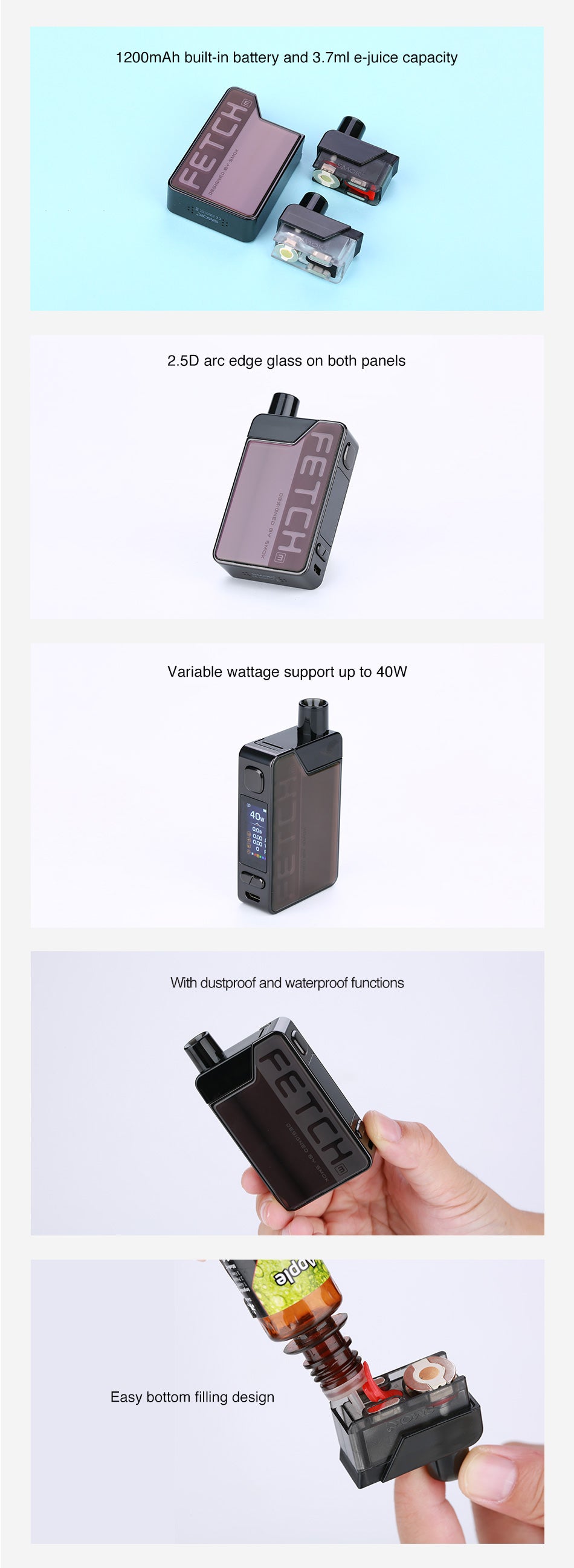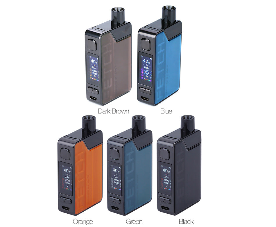 The SMOK Fetch Mini Kit is an internal battery refillable pod system in response to the ultra-portable pod system craze of 2019. Combined 2.5D arc edge glass on both panels and ultra-tiny size with the ergonomic design which gives Fetch Mini portable features and stunning appearance. Applying laser UV transfer texturing under glass panels, further adding to the 3D effects. One of the materials used in the construction of the Fetch Mini is PCTG which is known to be eco-friendly and approved by the FDA and EU for any type of applications with food contact. The Fetch Mini features an 1200mAh internal battery capacity and has variable wattage support up to 40W. As for the 3.7ml refillable pod, it was utilized magnetic pod installation for convenient operation. The Fetch Mini Kit utilizes SMOK's new RPM coil series, an enlarged version of the SMOK Nord Coil series that focuses on the use of Mesh heating elements to offer fantastic flavor and optimization for either mouth-to-lung or direct-to-lung vaping. Also it comes the waterproof and dustproof functions, which enable to be safer in rainy environments and prevent dust ingress. What's more, via the optimally 0.96" TFT Screen display, all the relevant parameters, and settings can be conveniently read and monitored.