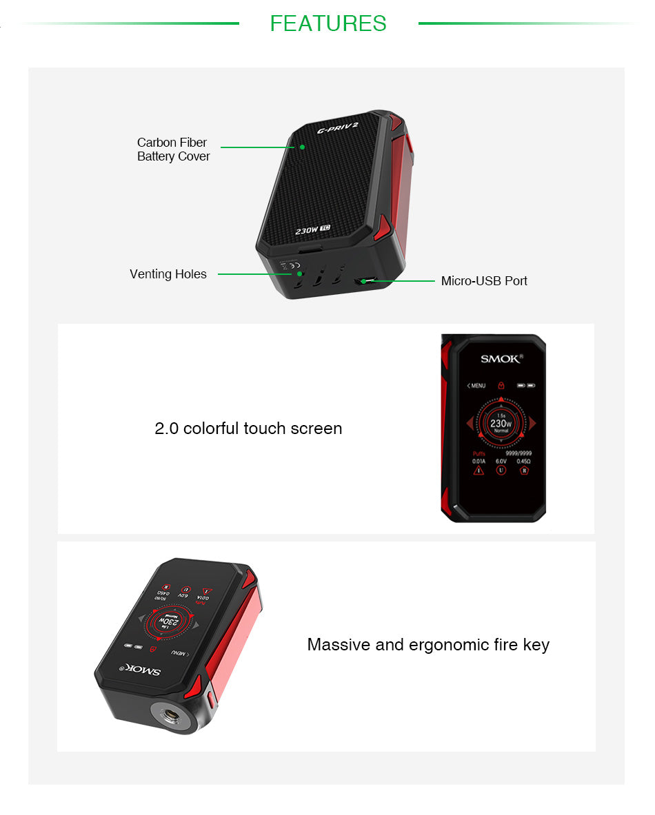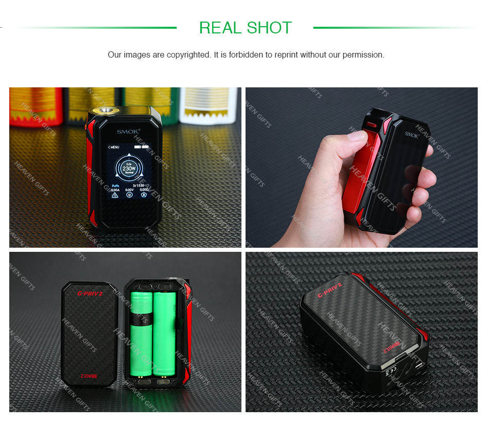 The SMOK G-PRIV 2 230W Touch Screen TC Box Mod measures 85mm x 52mm x 27.3mm, with an ergonomic designed that will give you a comfortable handfeel. Features an easy-to-read colorful touch screen, the G-priv 2 box mod is the smallest mod which works with 2 x 18650 batteries, the output can generate up to 230W of power, supports various output modes such as TC/VW modes. It delivers the apex in progression of the high performance box mod devices, featuring an upgrade to the class-leading touch-screen system with ergonomic features such as colorful high resolution display and comprehensive chipset. Comes with 8 colors.