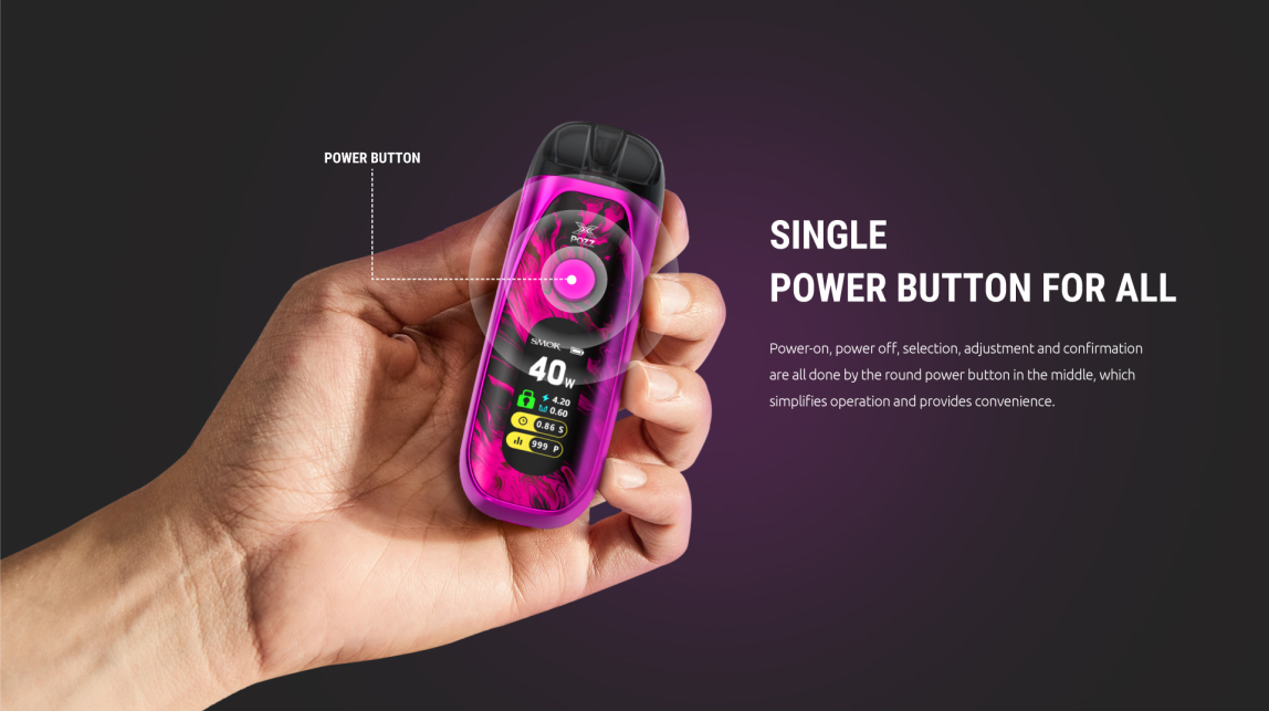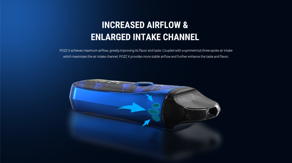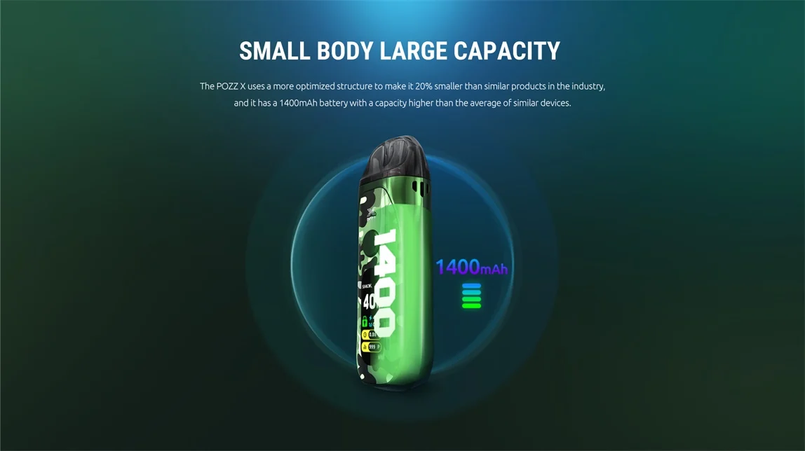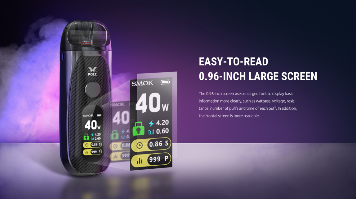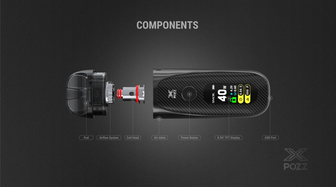 SMOK Pozz X Kit is powered by a 1400mAh battery which can fire up to 40w. Its panel is made from composite material with a four-layer structure, which ensures that POZZ X is thinner, harder and shinier. In addition, the Pozz X kit's main body frontal is equipped with a 0.96-inch screen that uses the enlarged font to display basic information more clearly, such as wattage, voltage, resistance, number of puffs and time of each puff. A one-button circular fire button at the top of the screen simplifies operations and provides convenience.As for SMOK Pozz X Pod, it has a large e-lquid capacity of 4.5ml, ensuring a long and relaxing vaping. Open the silicone plug on the side for liquid filling, fast and easy. SMOK Pozz X Pod is compatible with all RPM40 coils including the RPM RBA coil to maximize coil compatibility and meet the vaping needs of high-end users. In addition, the bottom of the POZZ X RPM pod is equipped with an adjustable airflow ring, which tightly surrounds the coil, forming the shortest path for the airflow to the coil, thereby maximizing flavor enjoyment and vapor production.