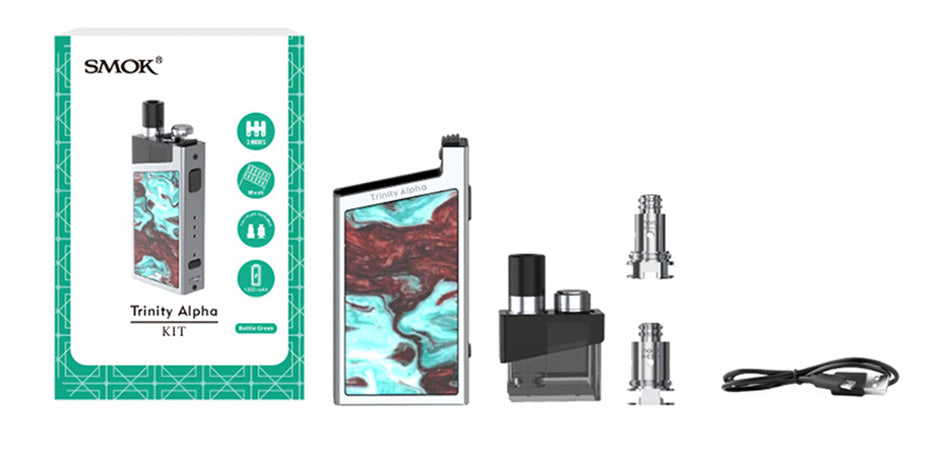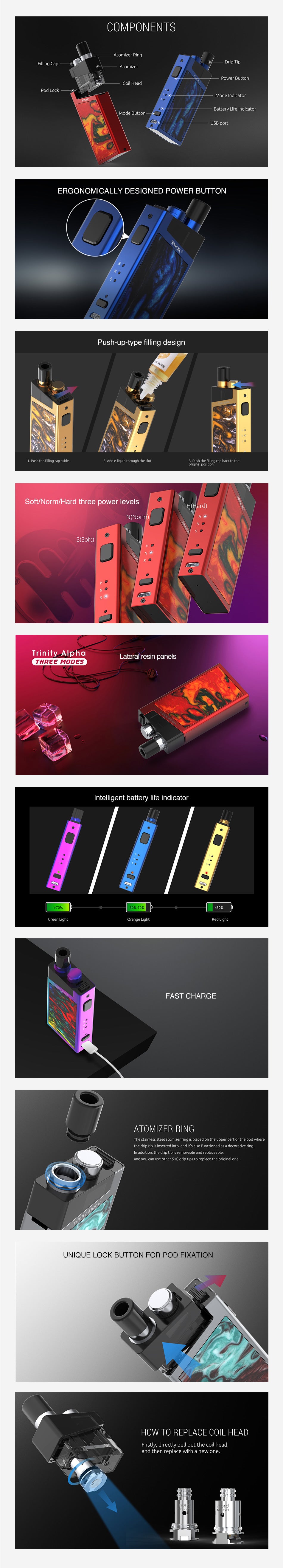 SMOK Trinity Alpha Kit is a latest open pod system by SMOK with a smart response system, resin decoration panels, unique pod structure which shows its meticulous attention to detail and a fine combination of vape and art. It has a black big power button, ergonomically designed, which is placed at the lateral side together with other functional buttons, easy to find and easy to operate. Featuring one 1000mAh internal battery and two Nord Mesh coils, boasting many novel features to deliver diversified vaping pleasures. The power range of Trinity Alpha is between 10 watts and 25 watts, and it has three modes to satisfy different vaping demands: S(Soft) / N(Norm) / H(Hard). Trinity Alpha uses top refill system with a stainless steel filling cap for convenient e-lquid refilling and leakproof purpose as well. As for its pod, it adopts an ingenious push-up-type design on its filling cap to ensure everyday long-lasting vaping with a maximum e-lquid capacity of 2.8ml. 6 colors are available.