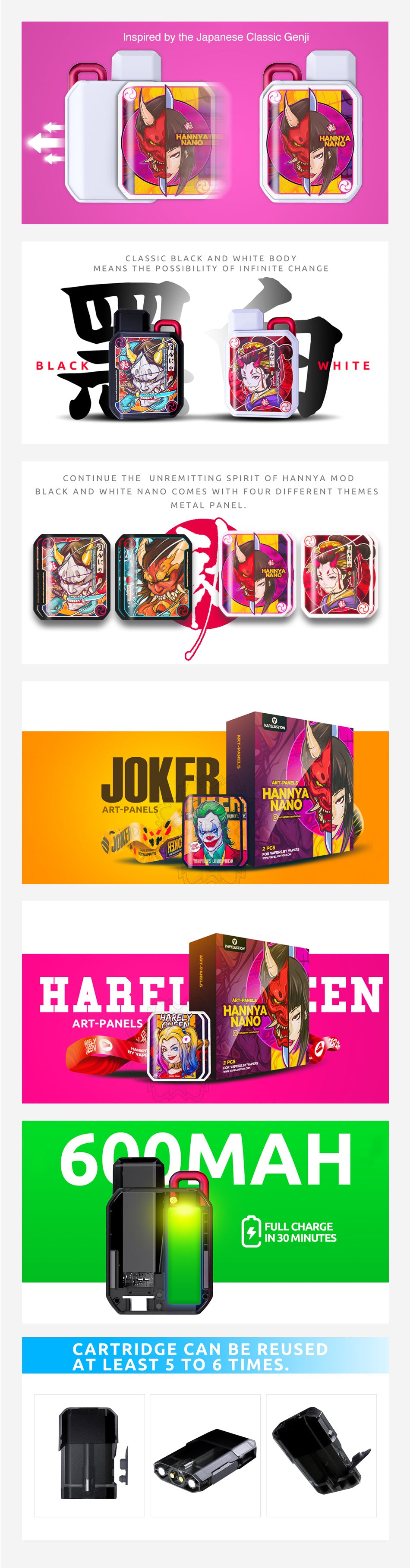 The Vapelustion Hannya Nano Kit comes with a traditional classic body, which means the possibility of infinite change. Hannya Nano is constructed from Plastic and Metal material, it is powered by 600mAh Built-in Battery and comes with a 2ml e-juice capacity refillable pod cartridge and 1.2ohm resistance coil. Quickly charge via the Type-C port on the bottom, which can be fully charged in just 30 minutes for daily use. It continues the unremitting spirit of hannya mod black and white nano that comes with different themes metal panel, each of which is accompanied by a lanyard with the same theme.