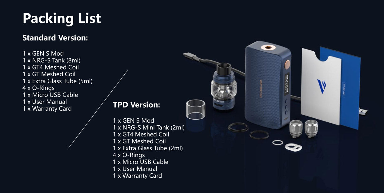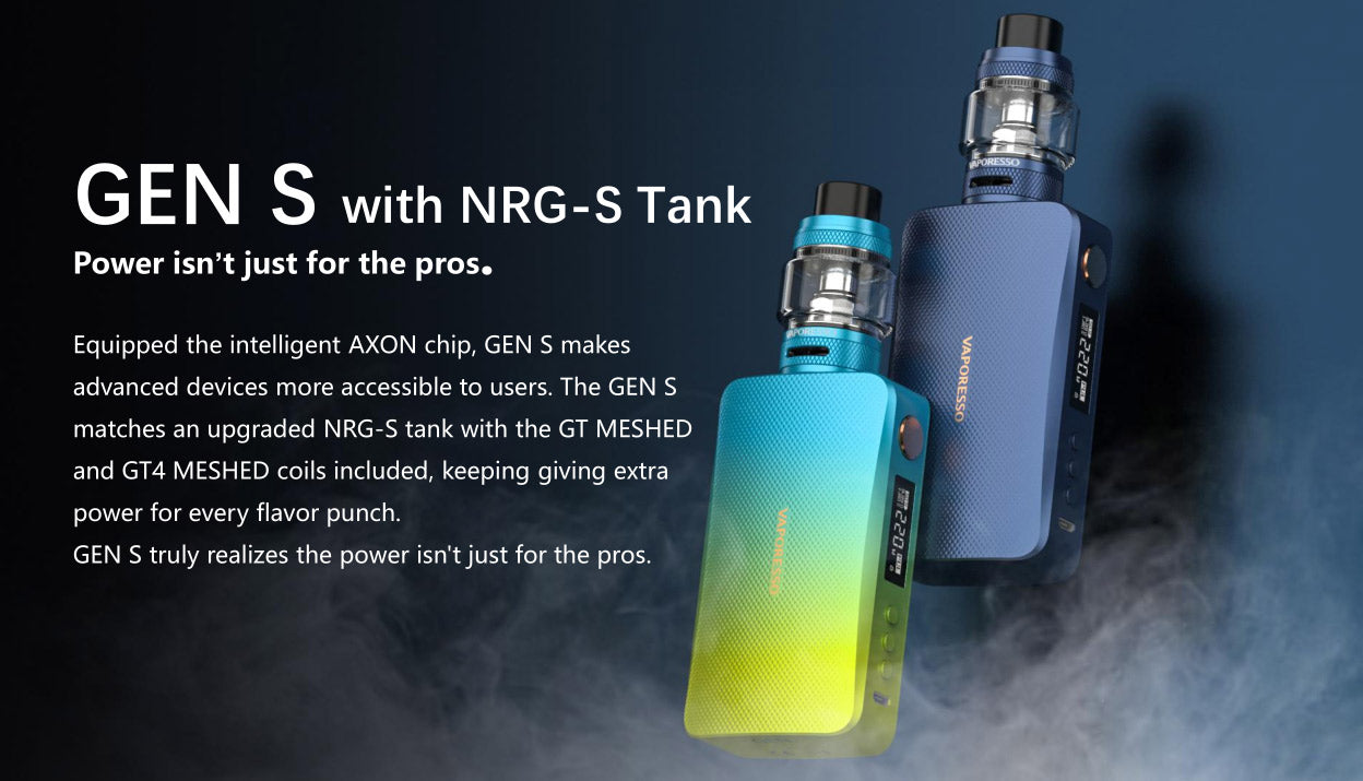 Vaporesso GEN S Kit consists of Vaporesso GEN S 220W Box Mod and the newly designed NRG-S Tank. Vaporesso GEN S embedded with the new AXON Chipset that results in a broad range of applicable resistances for the GEN Starter Kit and allows the GEN to access other modes like Pulse Mode, GEN S Kit can provide 220W maximum power and uses a four-button control interface for simple navigation and adjustments. Design-wise, the Vaporesso Gen S Mod features high-quality materials and a rubber finish that is gentle to the touch, ergonomic, flame-retardant, and fingerprint resistant. On the control face, you will see a unique 4-button design that permits absolutely effortless navigation of the modes and settings. And, vape data looks to be crystal clear for easy viewing. The GEN S matches an upgraded NRG-S tank with the GT MESHED and GT4 MESHED coils included, keeping giving extra power for every flavor punch. NRG-S Tank with max 8ml vape juice capacity. With the Vaporesso GEN S Kit, power isn't just for the pros. Designed for all users, the Vaporesso GEN S Kit with NRG-S Tank offers both simplicity and advanced features.