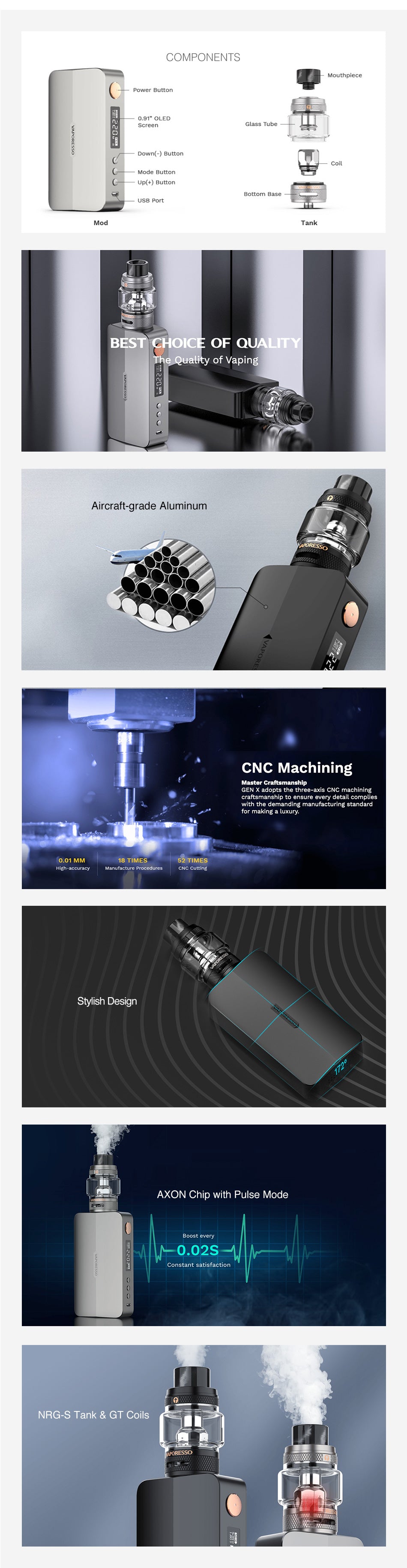 The Vaporesso GEN X is the first vaping device that combines the aircraft-grade aluminum material with CNC machining, brings impressive smooth hand-feel revealing its luxurious gene. And the Vaporesso GEN X Mod is powered by dual 18650 batteries that can provide 220W max output. As always, the Vaporesso GEN X uses the most representative intelligent Axon chip of the GEN series. So you can four powerful modes, Pulse Mode/Power ECO/Smart TC/DIY, for a friendly operating system. It is worth mentioning that the PULSE Mode boosts the inhalation every 0.02s to satisfy you with consistent performance. Naturally, I don not need to praise this excellent Vaporesso NRG-S Tank. The NRG-S Tank has 8ml large juice capacity. And the NRG-S Tank is equipped with 0.15ohm GT4 Meshed coill/0.18ohm GT Meshed coil which uses the upgraded MESHED technology to maximize interaction between e-juice and cotton, providing turbo heating performance. Moreover, the Vaporesso NRG-S Tank is easy to refill the e-juice and replace the coil.
