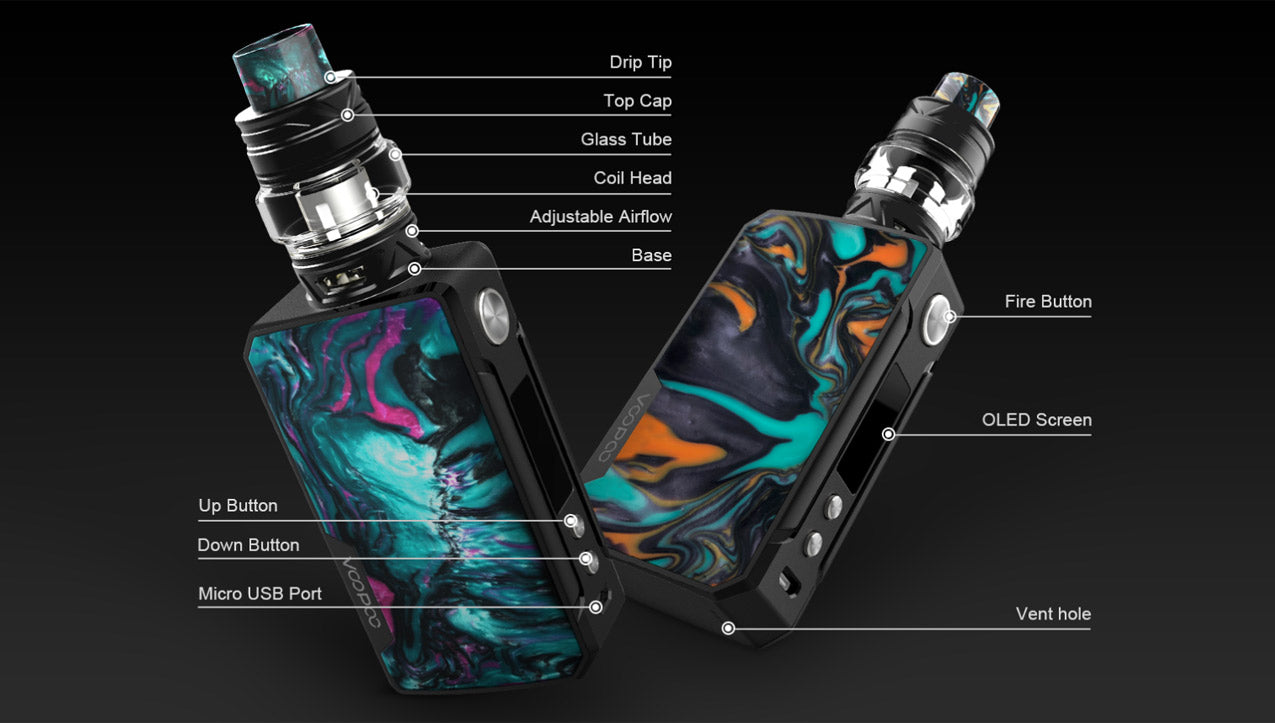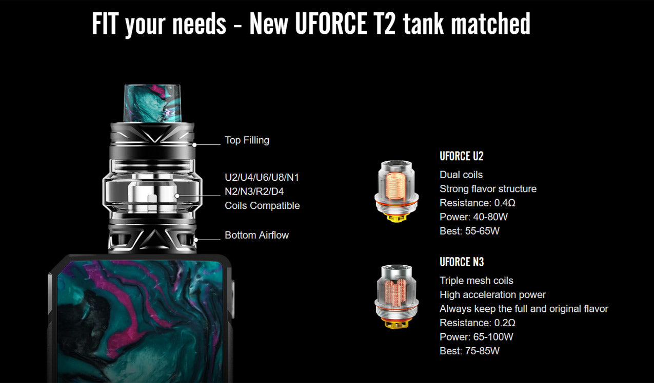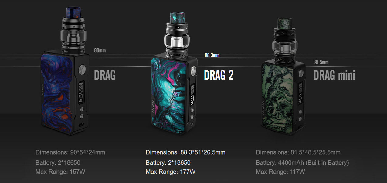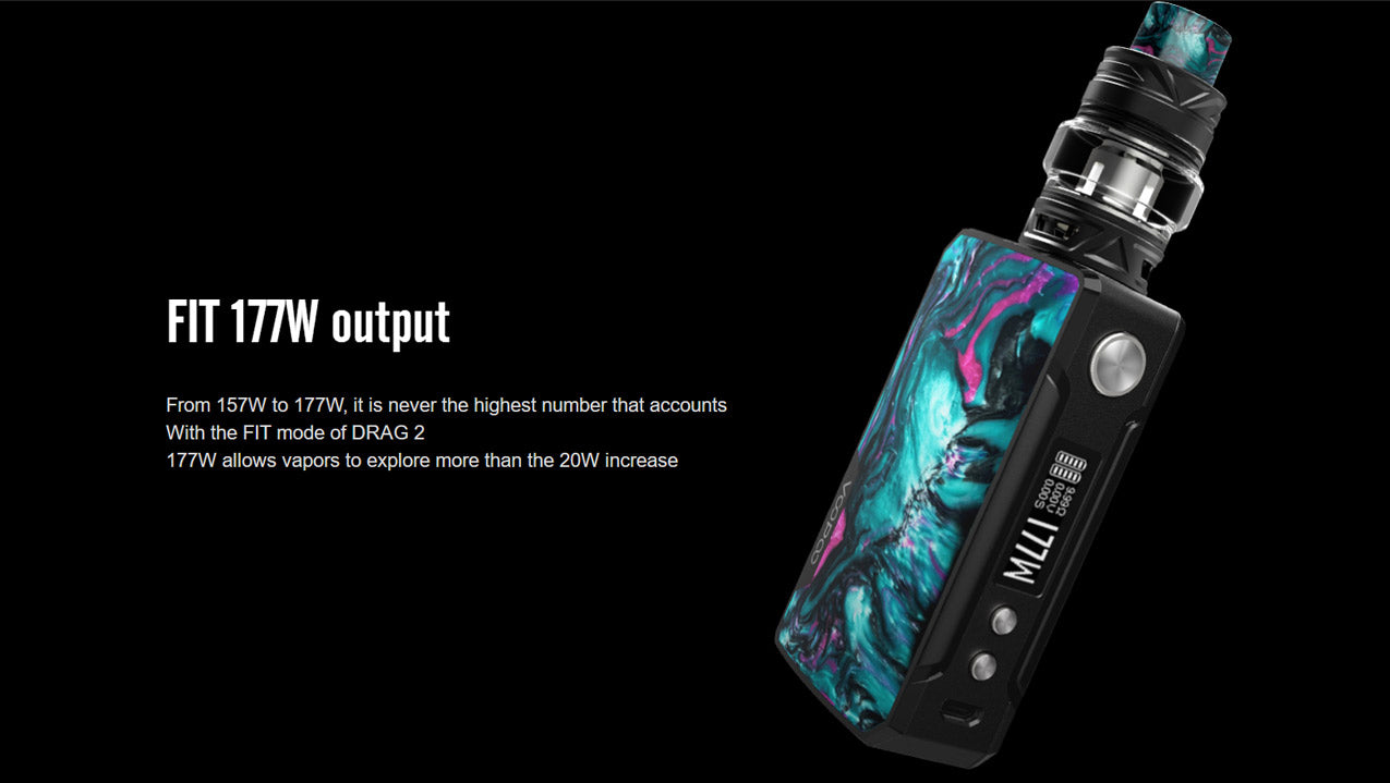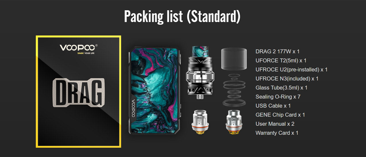 VOOPOO Drag 2 Kit is the updated version of the original VOOPOO Drag kit, which consists of the Drag 2 box mod and the brand new Uforce T2 tank. VOOPOO Drag V2 Kit features a compact size and smooth design, which is powered by dual high-rate 18650 batteries and maximum output can be reached to 177W. In addition to its high-end technical design, which is very streamlined with a colorful resin panel on one side, the mod also looks modern. On the control face, you will see a crystal clear OLED display with a menu that displays the current battery level, mode, resistance or voltage, and wattage. Paired with New Uforce T2 tank, the Drag 2 kit will provide better vaping experience. The tank utilizes new N3 mesh coil to achieve purer flavor and stronger clouds.