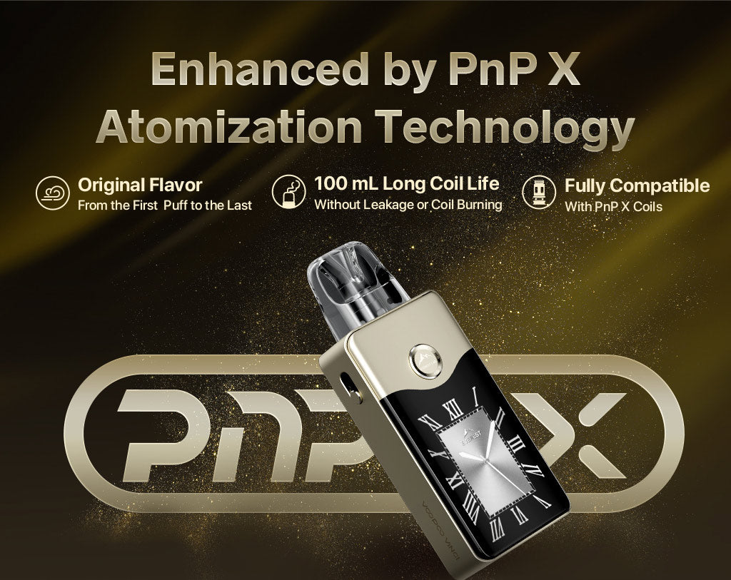 Voopoo VINCI E120 Kit is designed with 4500mAh battery, providing 5-120W power range. The 2.4-inch TFT high-resolution display functions as a canvas in the palm of hands, incorporating up to 18 exquisite watch-face screensavers for personalized customization. Enhanced by PnP X Atomization Tech, it ensures a 100 ml extended life without coil burning, leakage. VOOPOO VINCI E120 is equipped with VINCI PnP X Cartridge, and all VINCI PnP X Cartridge are fully compatible with PnP X Coils. Precise airflow control enables vaping across the full power range, from DTL to MTL.