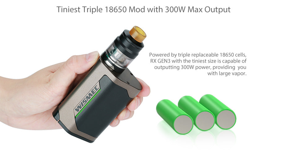 WISMEC RX GEN3 300W TC Kit with GNOME Tank the third generation of Reuleaux box mod, is smaller, lighter and more ergonomic than previous versions. Having a big 1.3inch OLED screen and brand-new interface, the GEN3 comes with three replaceable 18650 cells whose maximum output can reach 300W. Moreover, the latest bespoke firmware tailor made for the RX series will make GEN3 always up-to-date. The GNOME atomizer that packs the new WM coils for optimal flavor and retractable top design for easy filling can perfectly pair with GEN3 in terms of appearance and performance.