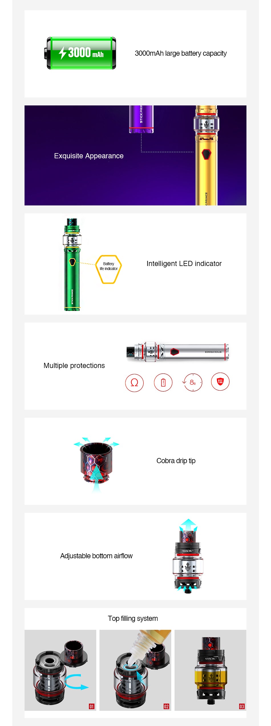 SMOK Stick Prince Starter Kit comes with a powerful combination of 3000mAh Stick Prince Battery and TFV12 Prince tank, it is born to be a legend. Stick Prince's large battery capacity is the best guarantee for long time vaping and LED indicator on its body can tell you the specific conditions of itself. Max 100W output wattage. The TFV12 Prince has 8ml large capacity and hyper engines, which can bring you massive vapor. Besides, the tank's patented locking mechanism can effectively solve the leakage problem. It is newly designed, with a special hexagon power button and a carefully carved battery base you can feel how exquisite it is.Available in 8 colors.