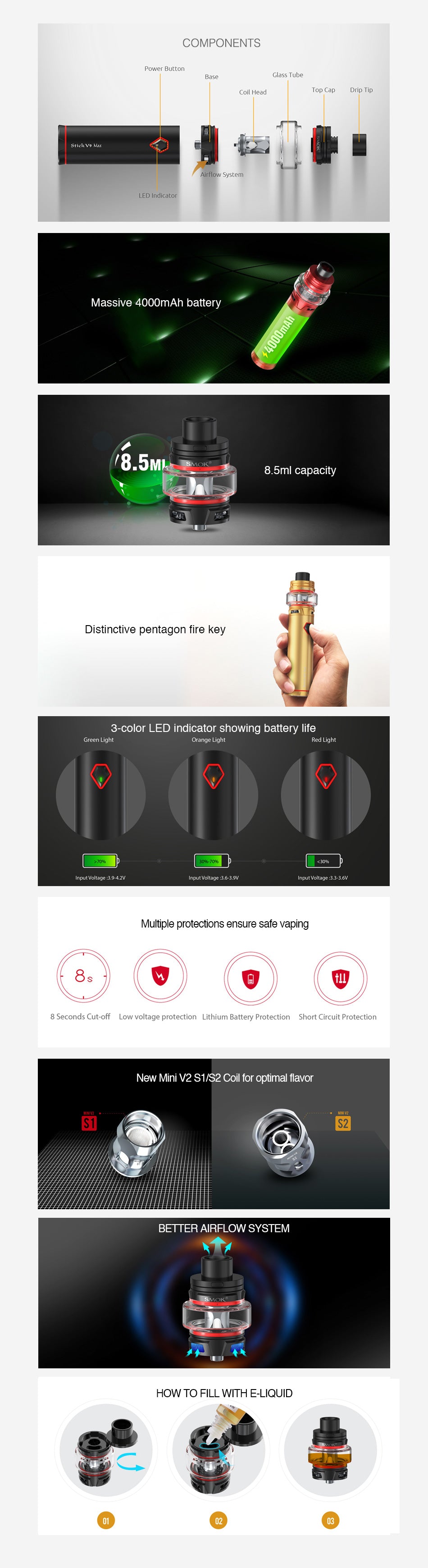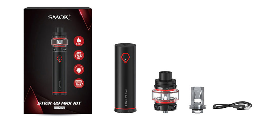 The Smok Stick V9 Max Kit consists of the Stick V9 Max Battery and the Stick V9 Max Tank. Which is powered by built-in 4000mAh battery the largest battery capacity and capable of 60W output. SMOK Stick V9 Max Starter Kit comes with a intelligence LED indicator show you clear battery power. Equipped with SMOK Stick V9 Max Tank, it holds up 8.5 super large e-juice capacity and is design for Stick V9 Max Kit. The Stick V9 Max Tank utilizes Mini V2 S1 coil and Mini V2 S2 coil, both of them are custom-made and work for lower wattage but with intense clouds. Stick V9 Max tank is the largest tank ever designed by SMOK. Even bigger bulb glass tube. Even larger filling slot that can easily drip e-lquid into the tank. Upgraded airflow system with even wider three airflow slots.