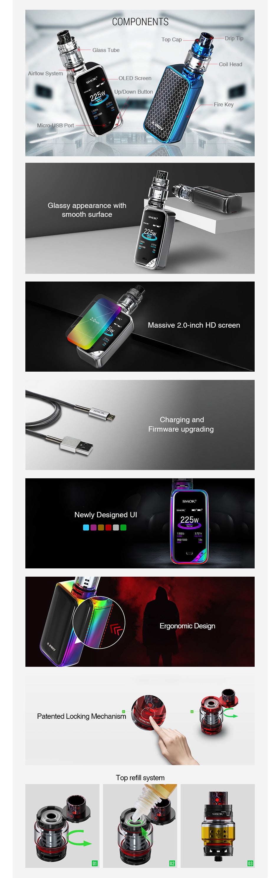 The SMOK X-Priv 225W TC Kit is the latest vape kits by Smoktech, has an incredible 8.0ml increased capacity with a unique crown-style design that features a bulb shaped glass tube. The TFV12 Prince is the upgraded version of the original TFV12 with new hyper engine Prince V12 atomizer heads that are designed for increased flavor and vapor production. The TFV12 Prince is topped off with a majestic wide bore Cobra resin drip tip that is sure to stand out. Comes with 7 colors.