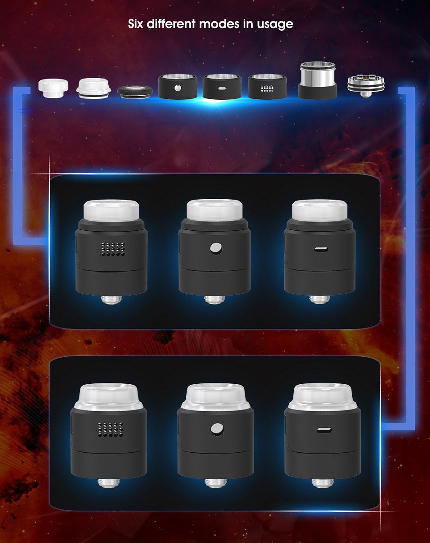 Vandy Vape Widowmaker RDA is designed by El Mono Vapeador and Vandy Vape. Made of high quality 304 SS, the 24mm diameter deck supports single and dual coil build, you can build it by your preference and enjoy excellent taste. It has three types of airflow caps and two kinds of drip tips for supporting multiple modes in usage. Each of airflow cap will provide smooth airflow and massive clouds. The deck supports single and dual coil build. You can build it by your preference and enjoy excellent taste. This RDA also features leaking-proof design. 5 colors for you to choose.