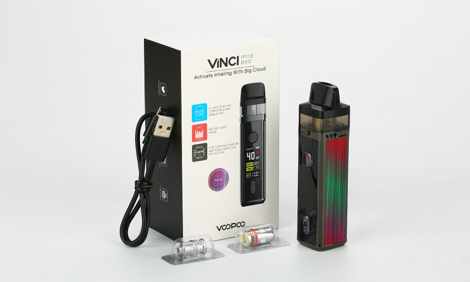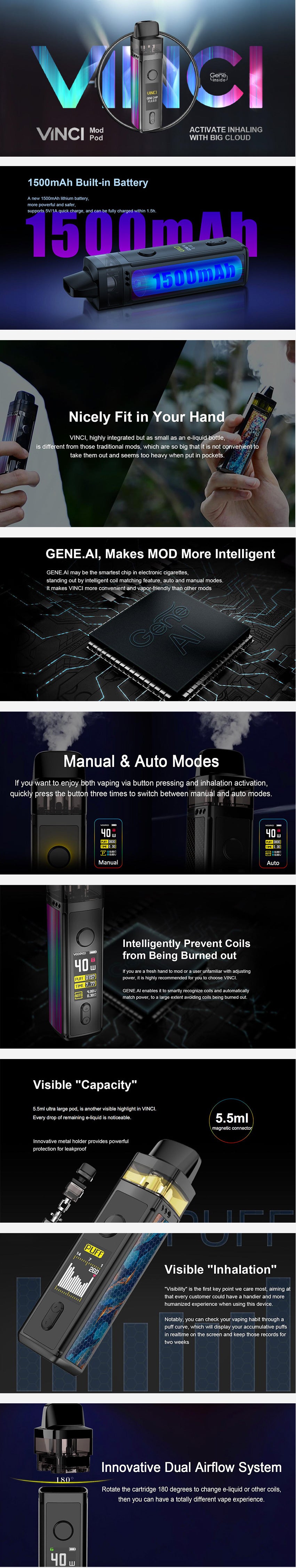 VOOPOO VINCI Mod Pod Kit is a new innovative ultra-portable pod mod kit which combining the advantages of both pod devices and box mods. Powered by the new generation of GENE.AI chip with 1500mAh built-in battery, it can fire up to 40W output, and support manual and auto modes to meet your different vaping needs. It is constructed from zinc alloy material which is decorated with various pattern panels to give you a different sense of vision. With the 0.96" inch TFT colorful screen, it can show you the status of the battery as well as the 2-week usage record of your device. What's more, the VINCI Mod Pod features the intelligently adjustable power to match coils and bring an excellent flavor. Plus the brand-new 5.5ml visible pod with unique PnP-VM1 coils, it is compatible with both regular e-juice. There are multiple protections to ensure your vaping safe.