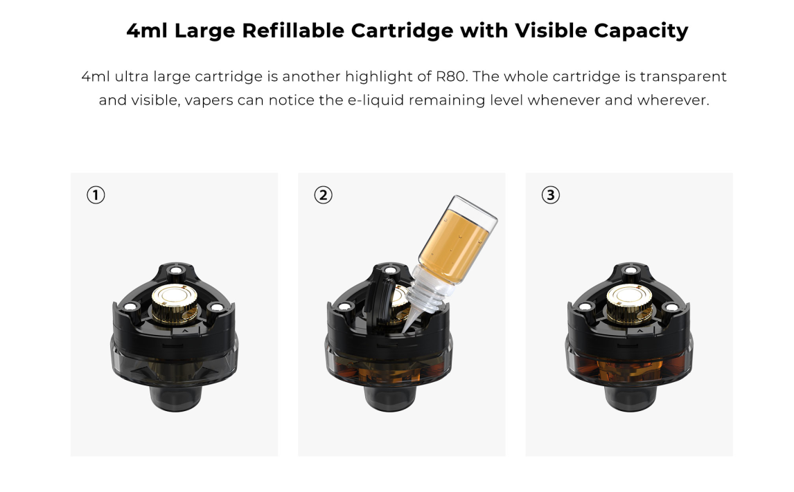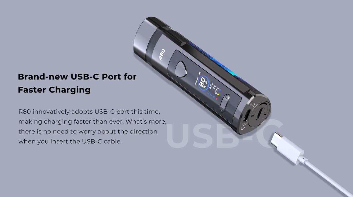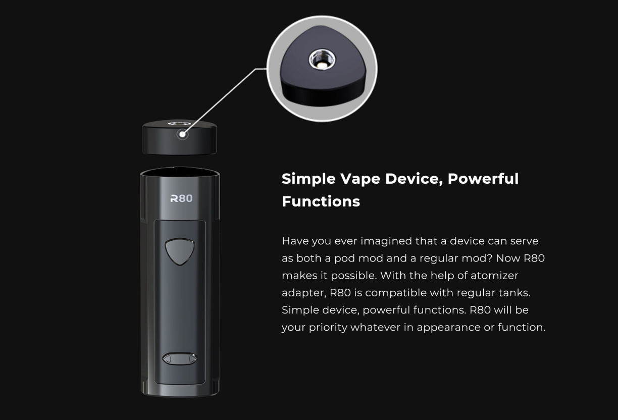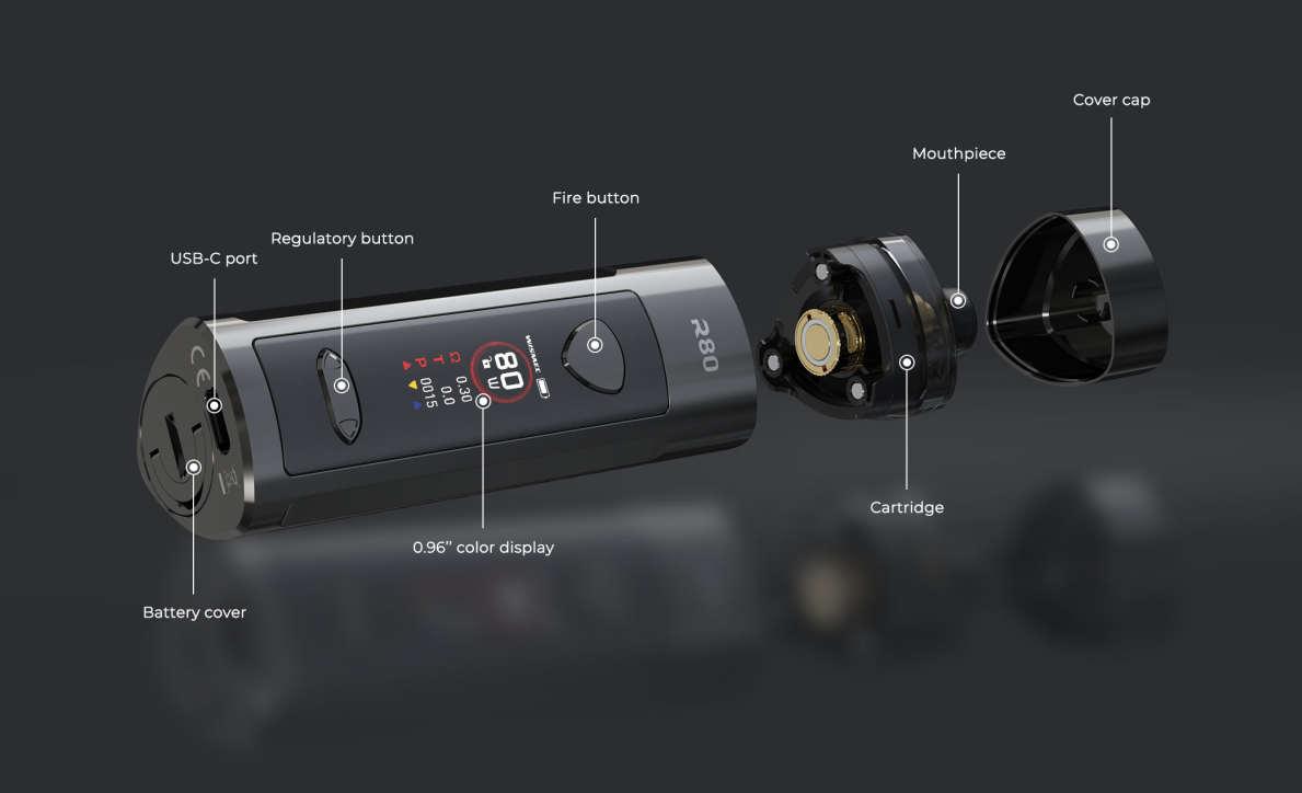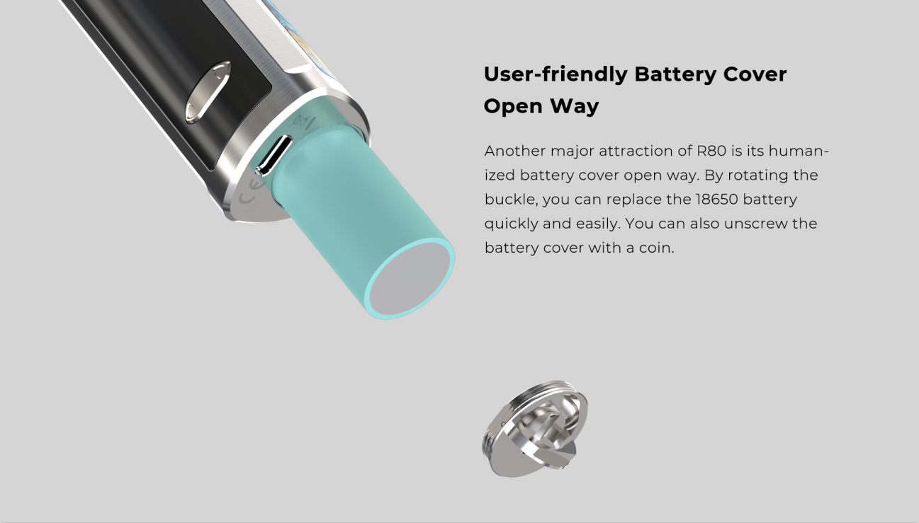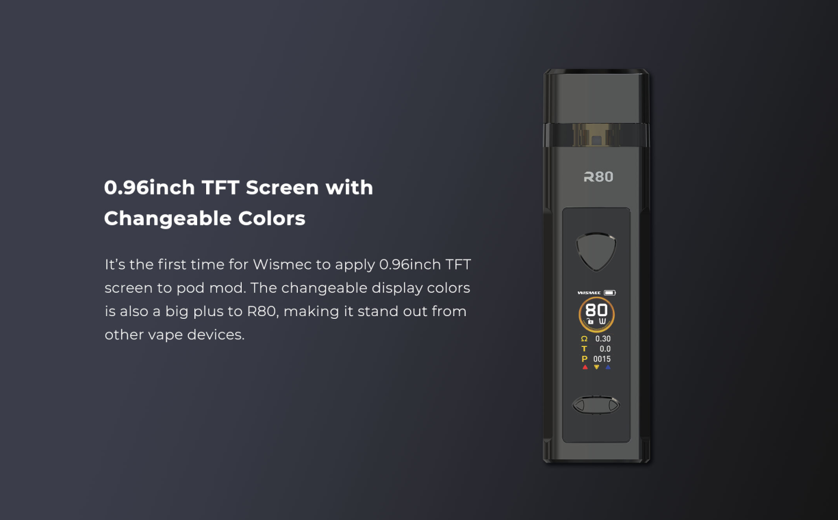 Wismec R80 Kit is a portable and multifunctional device that can be used as both a Pod Mod kit and a regular Mod kit. With the help of an atomizer adapter, R80 is compatible with regular tanks. R80 pod kit adopts the replaceable 18650 cell structure innovatively, offering you 80W high power output and longer-lasting. Adopting USB-C port this time, making charging faster than ever. It is worth mentioning that, for the first time, Wismec applied a 0.96-inch TFT screen to the pod mod. The changeable display colors is also a big plus to R80, making it stand out from other vape devices. By rotating the buckle, you can replace the 18650 battery quickly and easily. You can also unscrew the battery cover with a coin. Besides, the Cover cap on the top of the machine effectively prevents leakage and dust. The Wismec R80 Pod cartridge has a large capacity of 4ml, which can store a large amount of e-juice for long-term vaping. R80 comes with KTR Mesh 0.3ohm coil and NiCr 0.8ohm coil, bringing vapers huge vapor cloud and optimal flavor. The whole cartridge is transparent and visible, vapers can notice the e-juice remaining level whenever and wherever.
